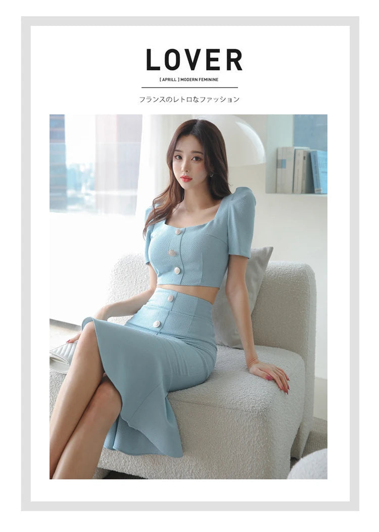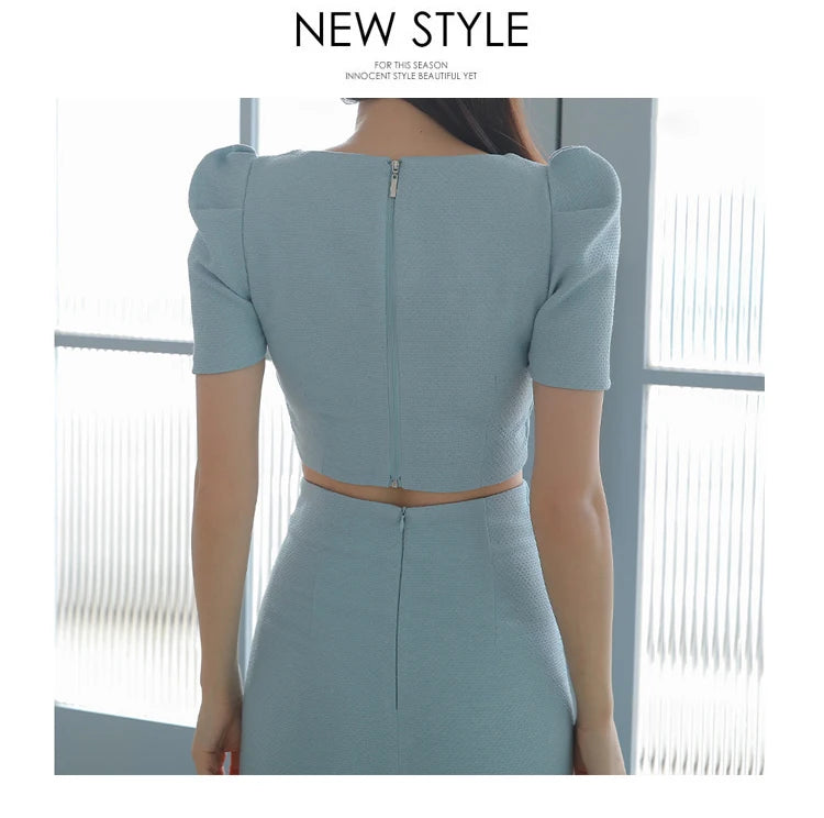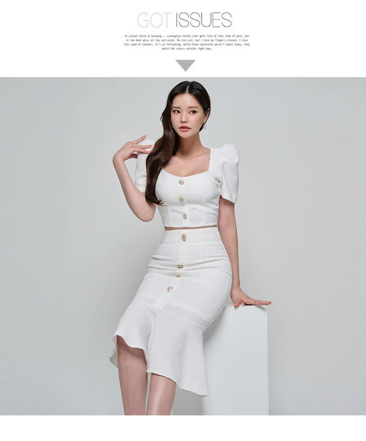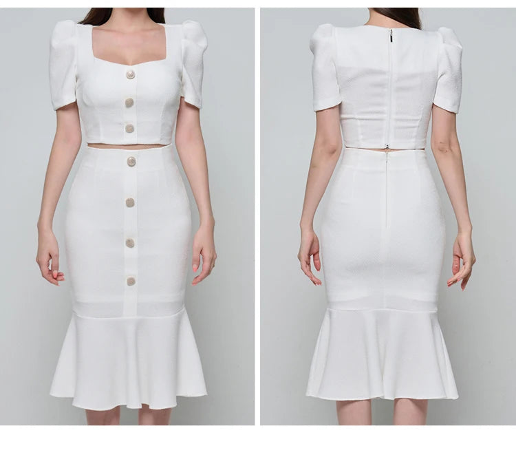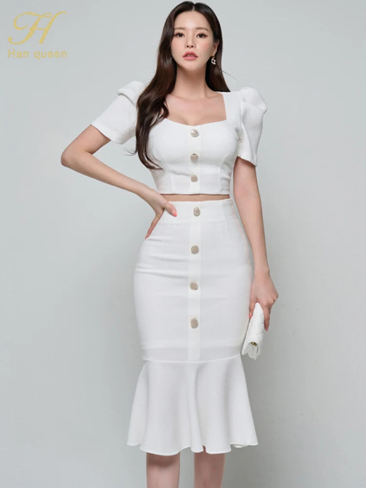 H Han Queen New Summer Womens 2 Pieces Suits Puff Sleeve Short Tops & Casual Fashion Sheath Mermaid Skirt Simple Work Sets