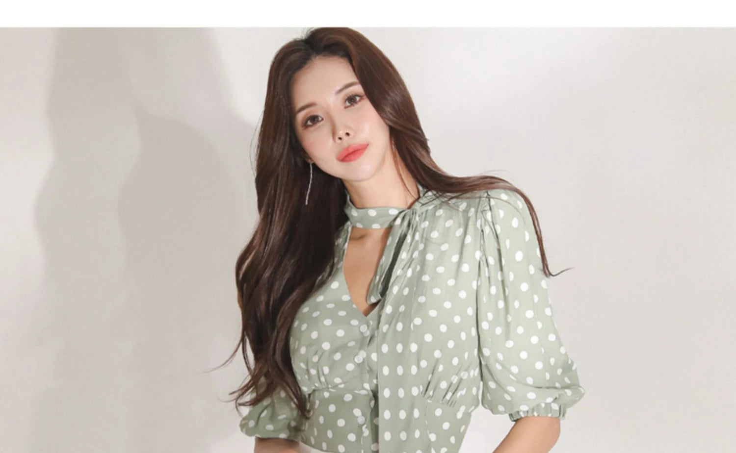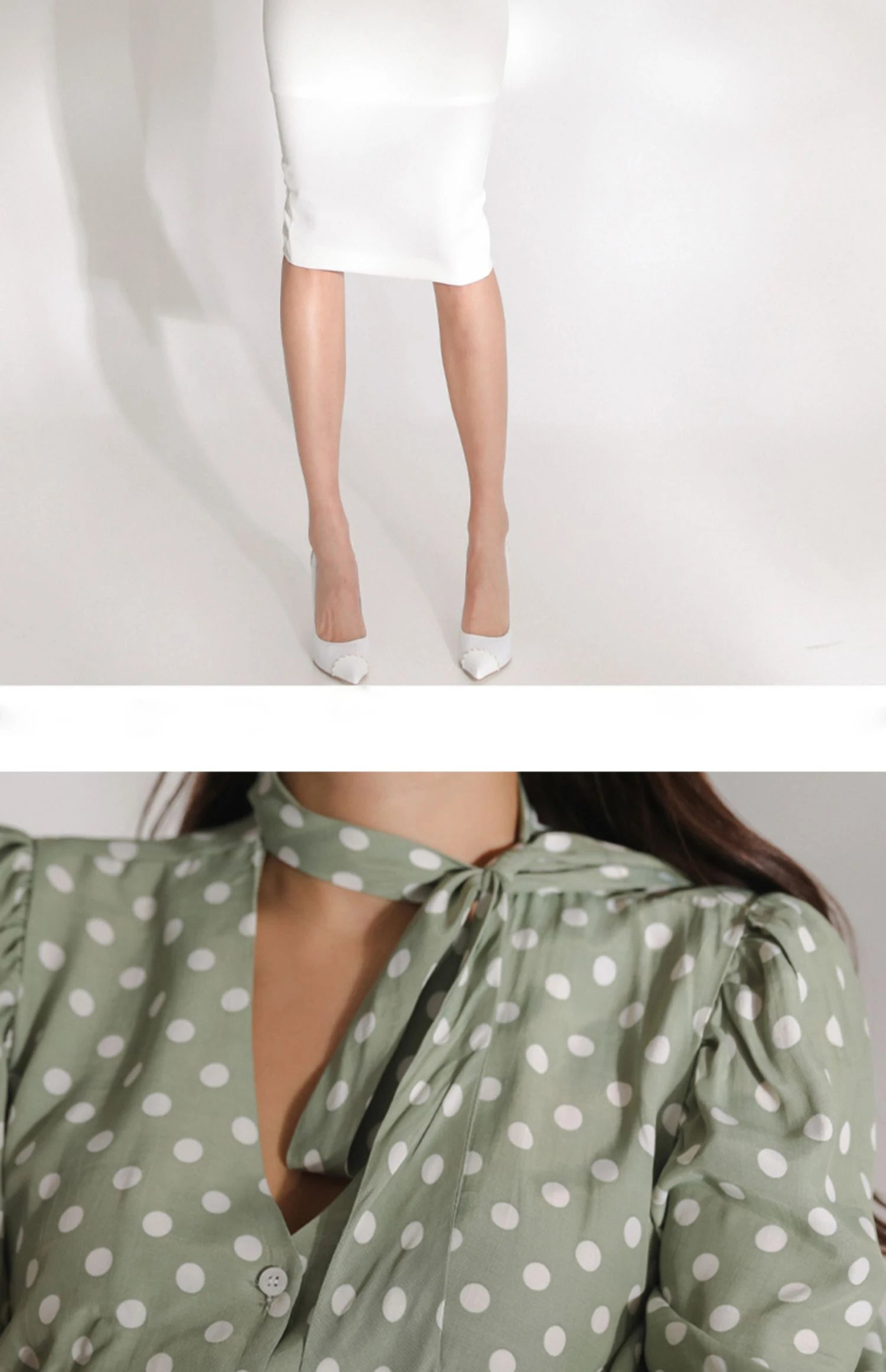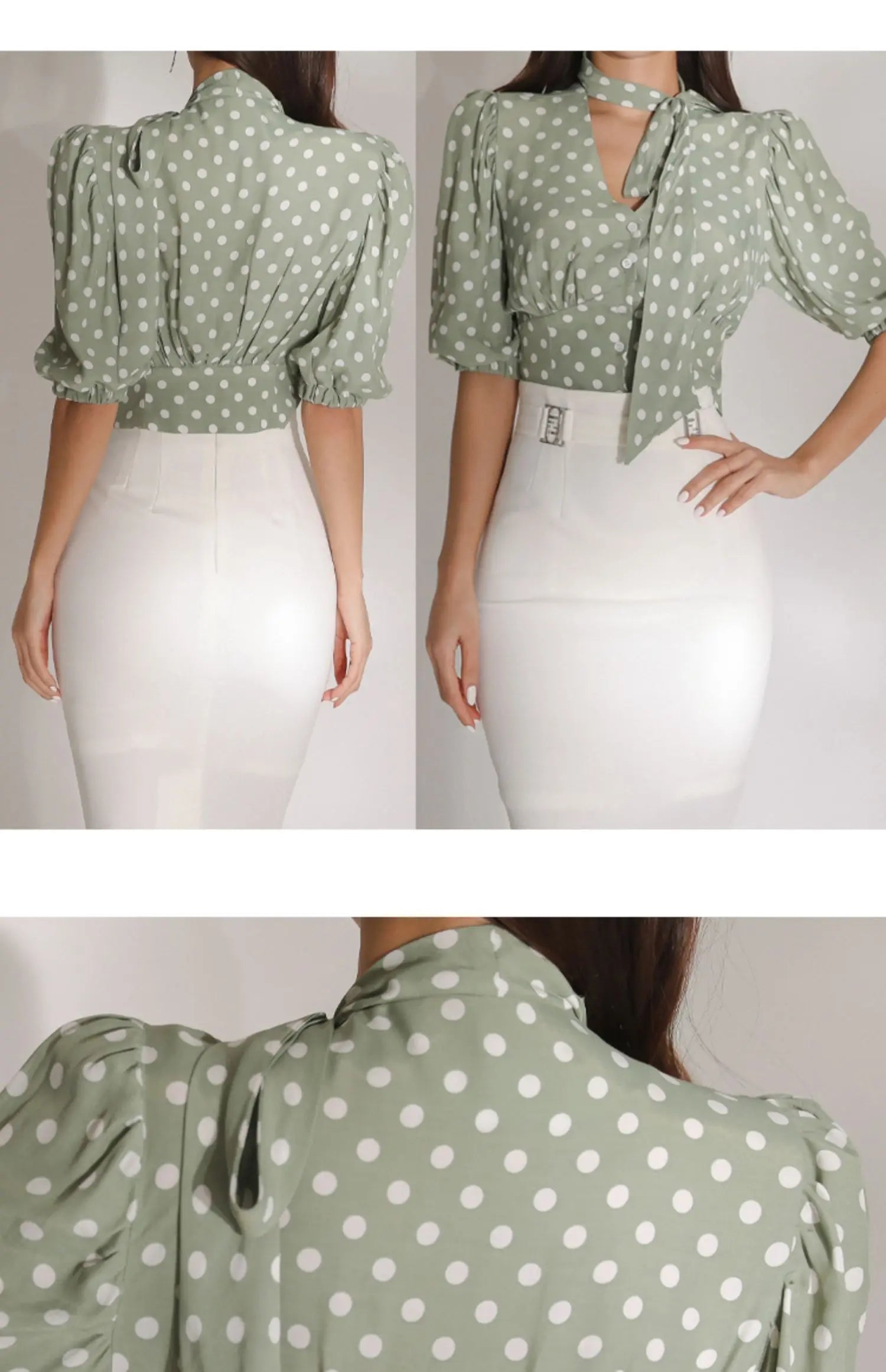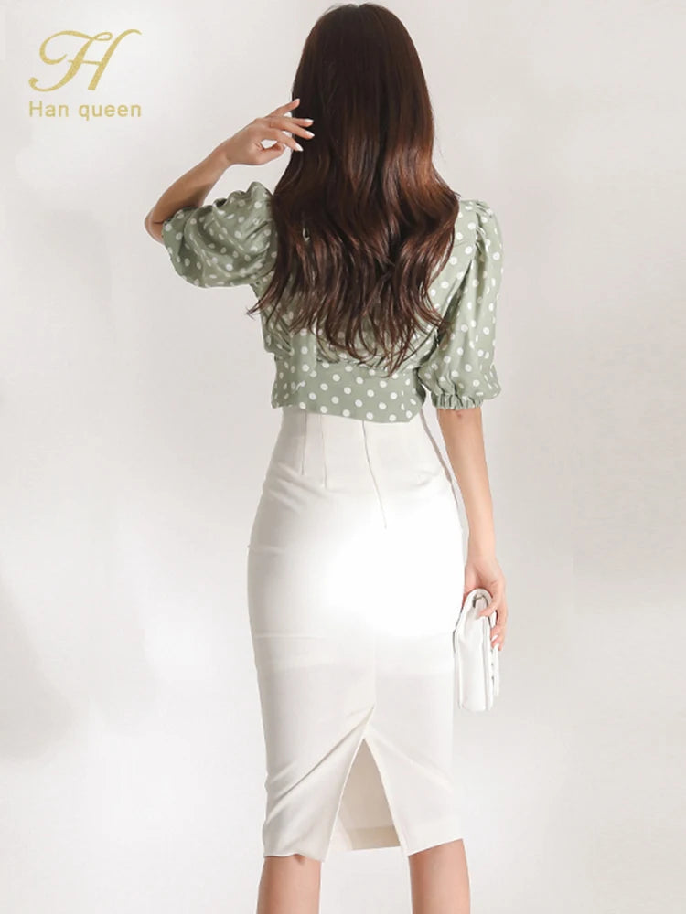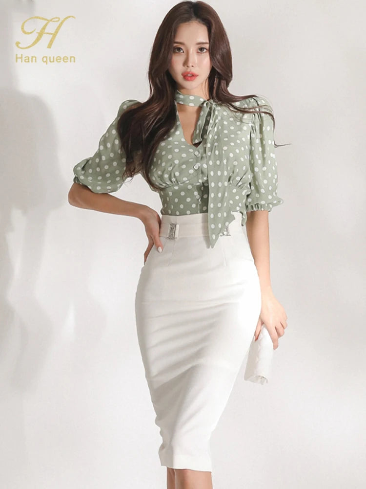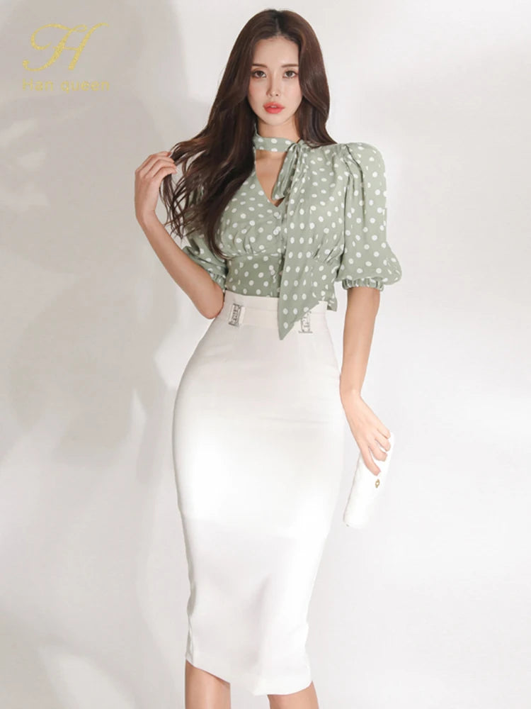 H Han Queen Korean Women Summer Sexy Work Wear 2 Pieces Set Dot Blouses & High Waist Mid-Calf Sheath Pencil Bodycon Skirt