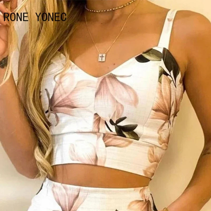 Two-Piece Women's Summer 2024 Tropical Casual Simple Shorts Suit Suspender Printed Top+Shorts Set for Female Clothing Outfits