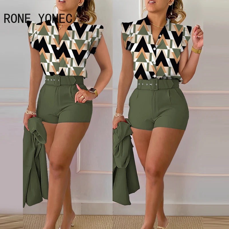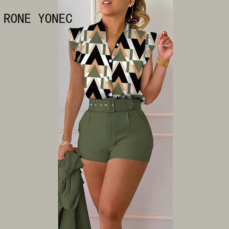 Women Casual Allover Print Top & Solid Bottom Flying Sleeves with Belts Short Sets