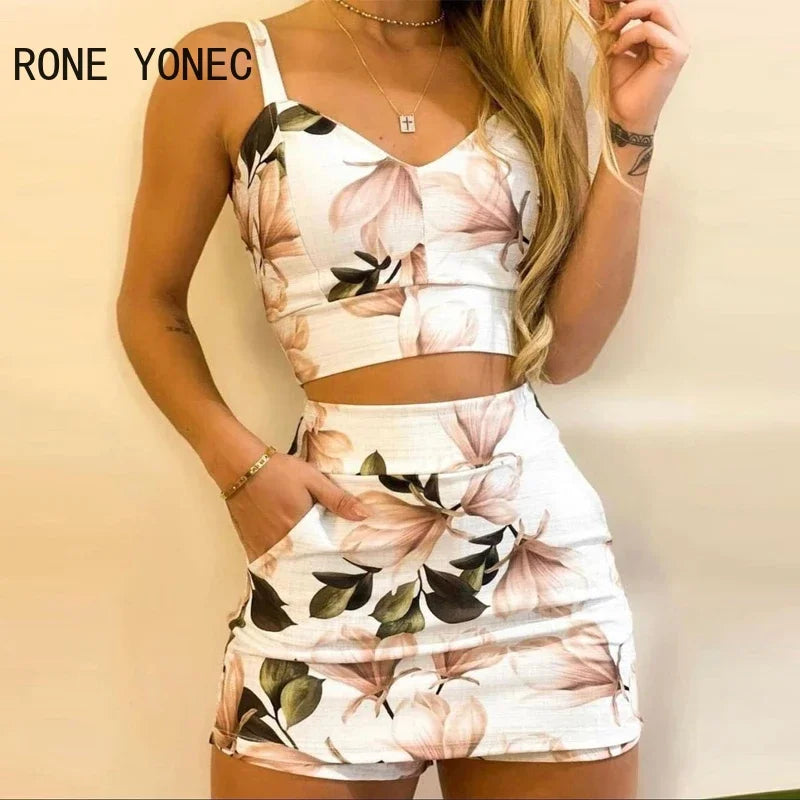 Women Sexy Chic Cami Sleeveless All Over Print Floral Pattern Summer Bodycon Mini Skirt Short Sets
