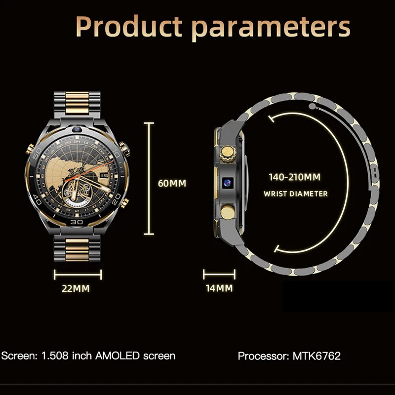 JT7 4G LTE Android 10 Smart Watch Men 1.508" Round HD AMOLED Display MTK6762 Octa Core Large 6GB 128GB Rom Dual Cameras 5G Wifi