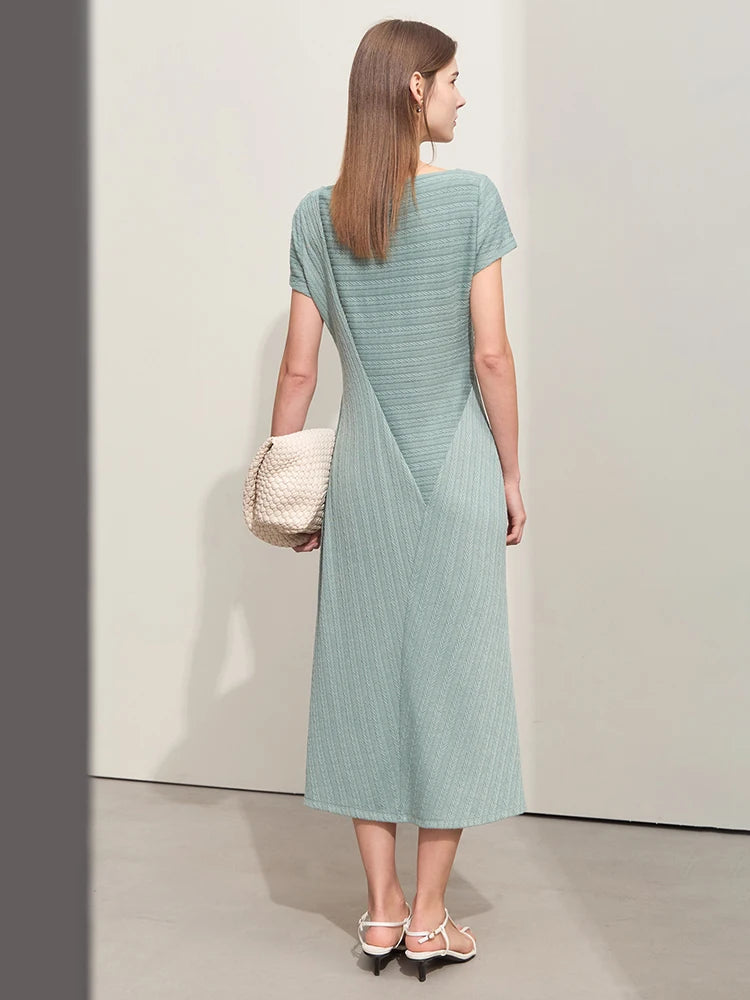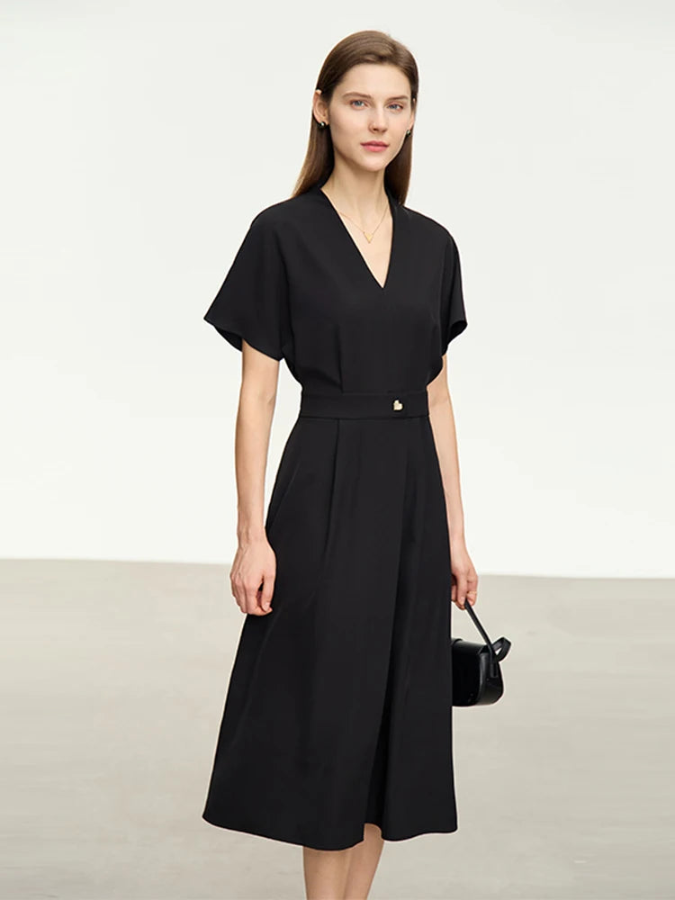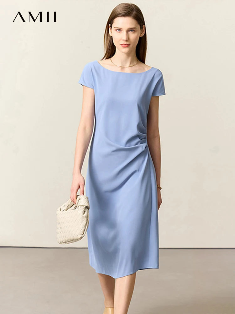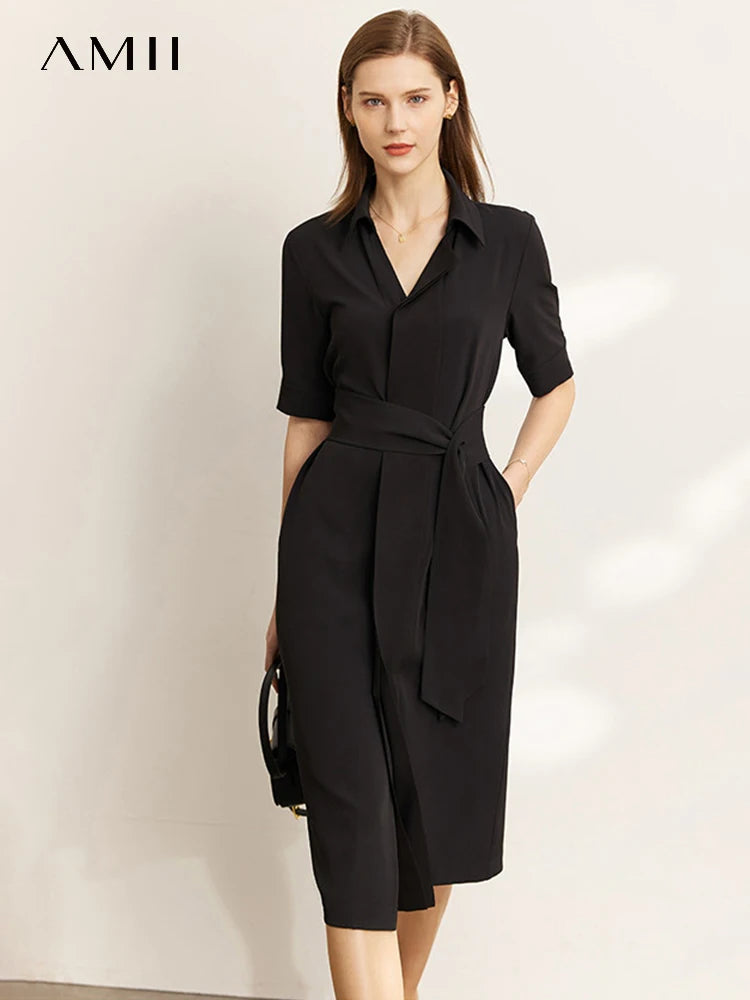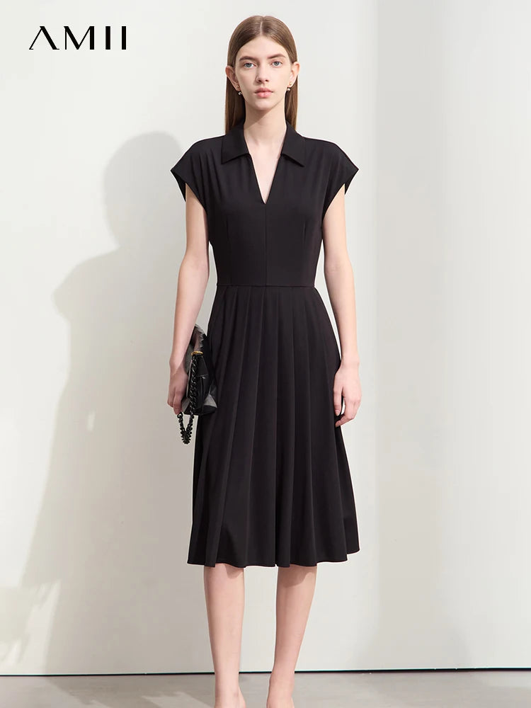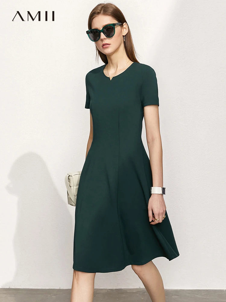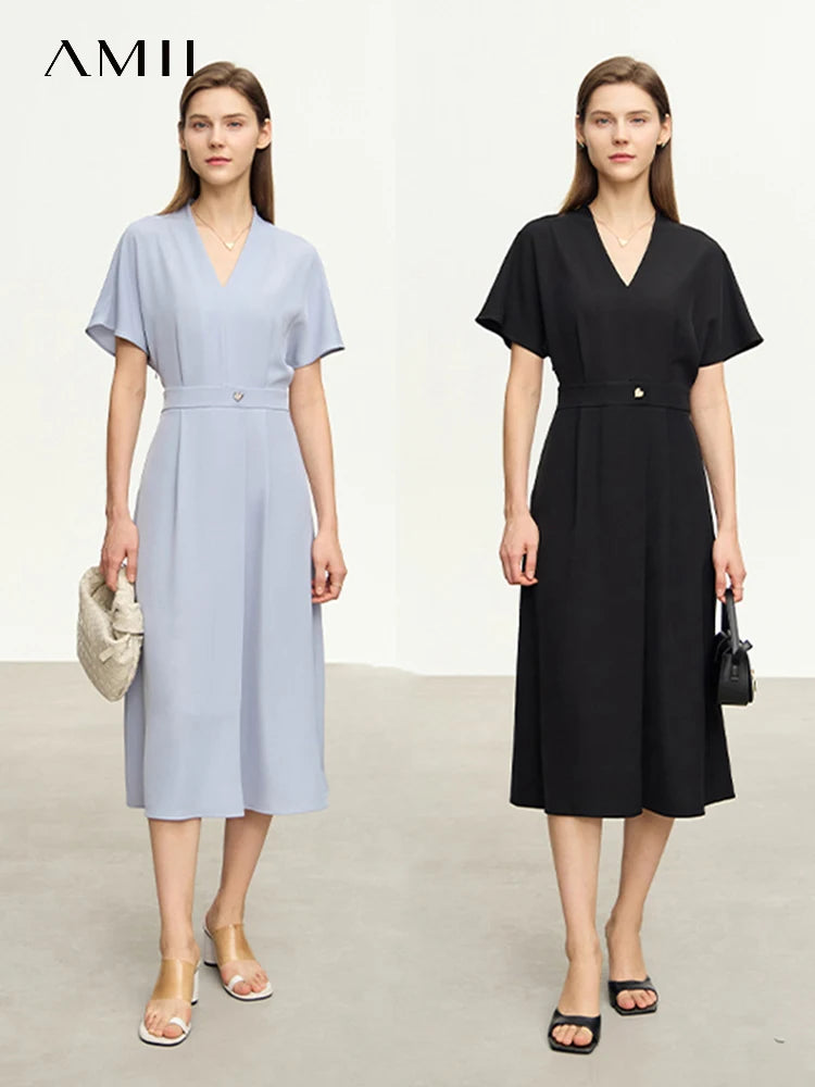 AMII Minimalism Dresses for Women 2023 Summer A-Line Elegant V-neck Short Sleeve Elastic Waist Office Female Midi Dress 12342596