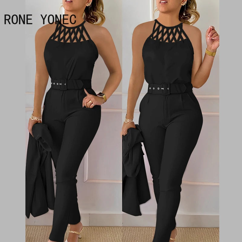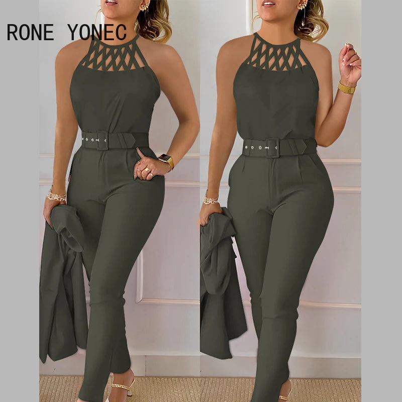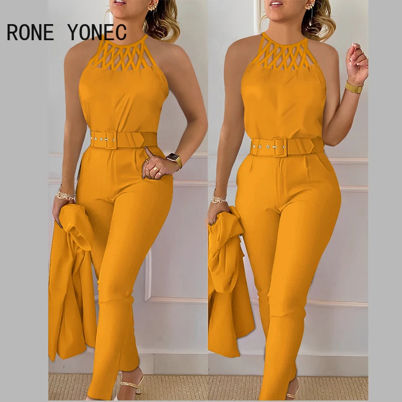 High Waist Sleeveless Crop Top and Skinny Flare Pants Set with Belt - Women's Fashion Two Piece Suit
