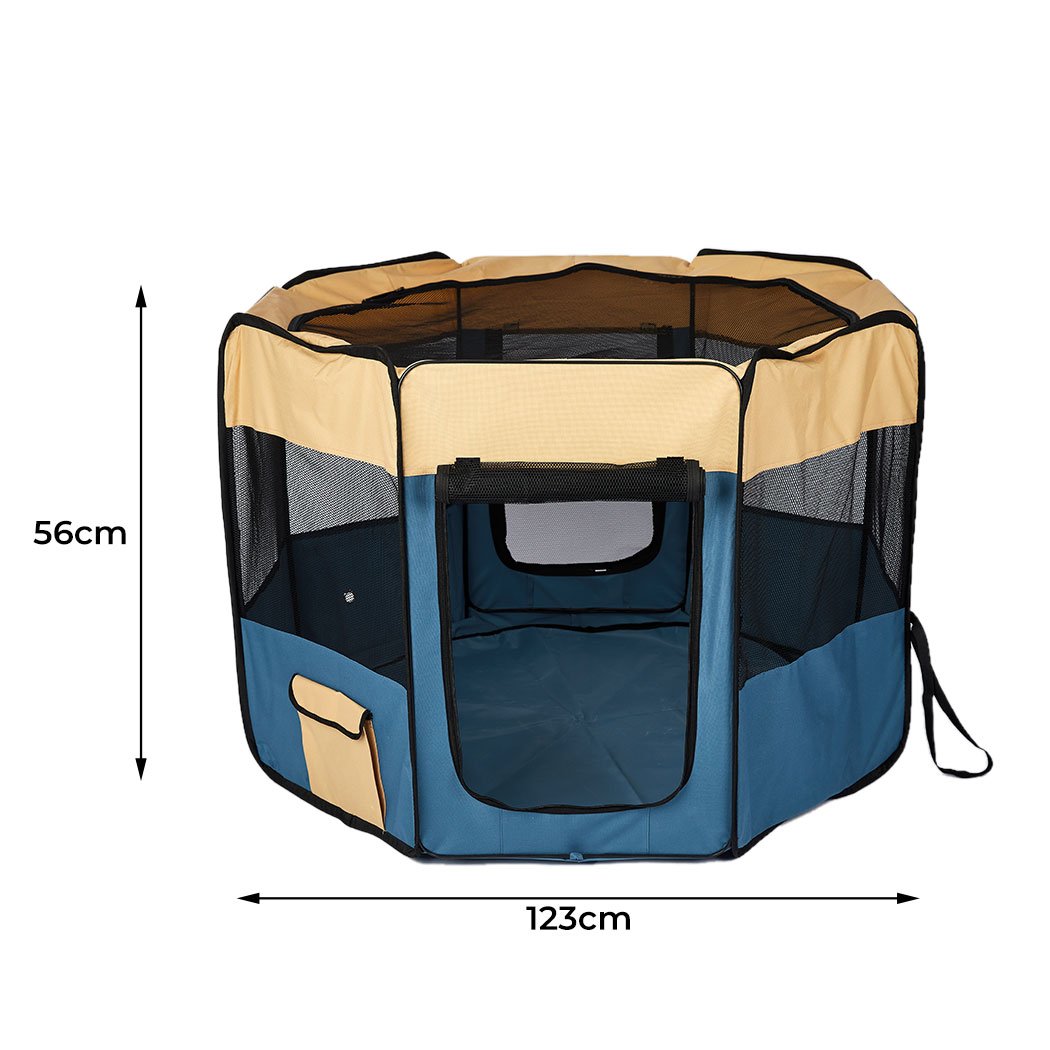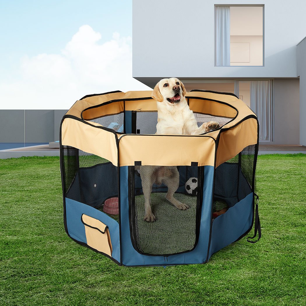 Made of high-quality 600D Polyester. Built tough and strong to withstand all those darnedest tantrums. Its polyester construction provides a wide range of advantages such as excellent water, scratch, and fade resistance. It comprises of durable mesh window with two inbuilt doors for better ventilation. The upper surface of the playpen is equipped with mesh for a comprehensive view of the surroundings and added safety. Store all your pet’s drinks and snacks - It also comes with a side pocket, mesh pouch, and elastic strap. Use its roll-up zipper to open and close the doors, provided with a double zipper for added security. Very easy to install, suitable for indoor and outdoor use.