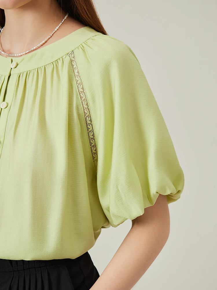 FSLE French Style Commuting Shirt Top For Women's 2024 Summer New Design Bubble Sleeves Blue White Green Tops 24FS12410